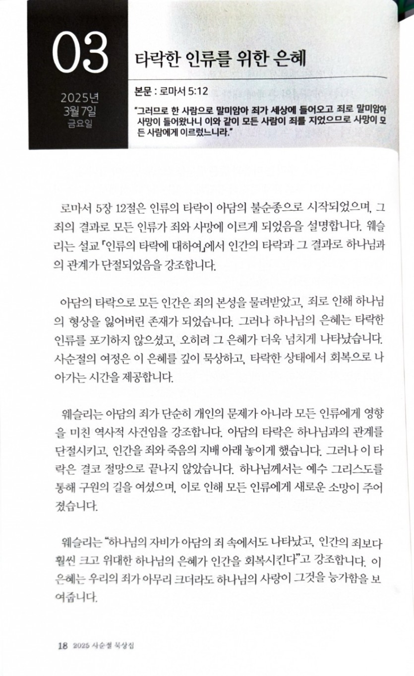 사순절 3일 묵상(타락한 인류를 위한 은혜) 진천교회 댓글 0건 조회 1,398회 작성일 2025-03-07 12:39 가 본문내용 확대/축소 본문 사순절 3일 묵상(타락한 인류를 위한 은혜)사순절 3일 묵상(타락한 인류를 위한 은혜) "그러므로 한 사람으로 말미암아 죄가 세상에 들어오고 죄로 말미암아 사망이 들어왔나니, 이와 같이 모든 사람이 죄를 지었으므로 사망이 모든 사람에게 이르렀느니라."로마서5장12절 목록 댓글목록 이전글3월 9일 주보 25.03.07 다음글사순절 2일 묵상(하나님께서 먼저 부르심)25.03.06