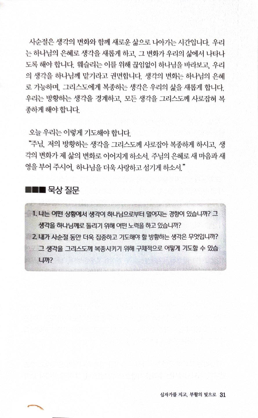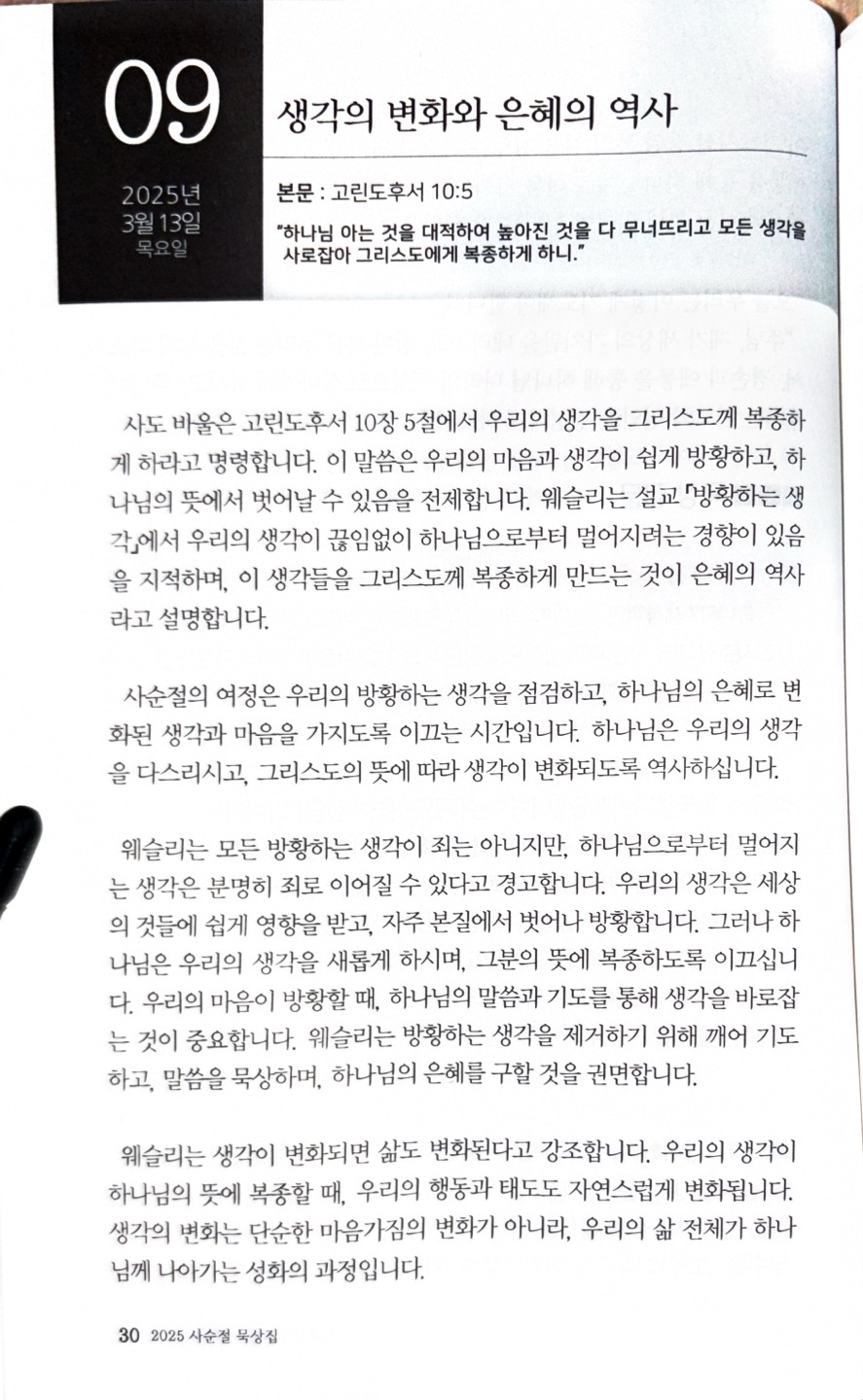 사순절 8일 묵상(생각의 변화와 은혜의 역사) 진천교회 댓글 0건 조회 1,370회 작성일 2025-03-13 08:46 가 본문내용 확대/축소 본문 사순절 8일 묵상(생각의 변화와 은혜의 역사)사순절 8일 묵상(생각의 변화와 은혜의 역사) "하나님 아는 것을 대적하여 높아진 것을 다 무너뜨리고 모든 생각을 사로잡아 그리스도에게 복종하게 하니."고린도후서 10장 5절 목록 댓글목록 이전글사순절 9일 묵상(분열을 치유하는 은혜) 25.03.14 다음글사순절 7일 묵상(참된 복으로 인도하시는 은혜)25.03.12