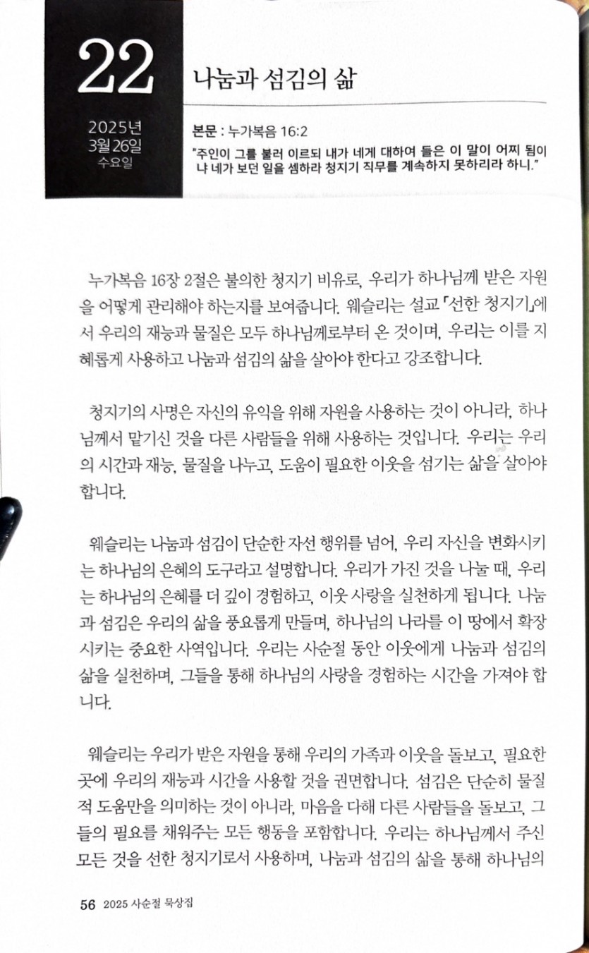 사순절 19일 묵상(나눔과 섬김의 삶) 진천교회 댓글 0건 조회 1,311회 작성일 2025-03-26 13:14 가 본문내용 확대/축소 본문 사순절 19일 묵상(나눔과 섬김의 삶)사순절 19일 묵상(나눔과 섬김의 삶) "주인이 그를 불러 이르되 내가 네게 대하여 들은 이 말이 어찌 됨이나 네가 보던 일을 셈하라 청지기 직무를 계속하지 못하리라 하니."누가복음16장2절 목록 댓글목록 이전글사순절 20일 묵상(믿음의 확신을 가지라) 25.03.27 다음글사순절 18일 묵상(성령의 역사와 참된 제자)25.03.25
