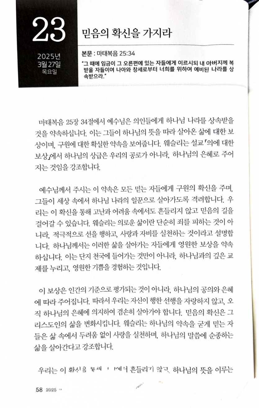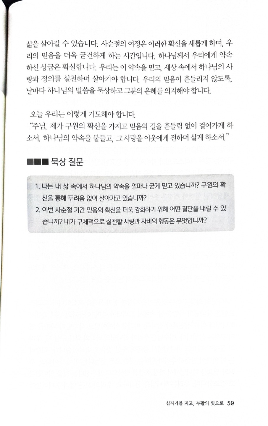 사순절 20일 묵상(믿음의 확신을 가지라) 진천교회 댓글 0건 조회 1,288회 작성일 2025-03-27 13:31 가 본문내용 확대/축소 본문 사순절 20일 묵상(믿음의 확신을 가지라)사순절 20일 묵상(믿음의 확신을 가지라) "그 때에 임금이 그 오른편에 있는 자들에게 이르시되 내 아버지께 복받은 자들이여 나아와 창세로부터 너희를 위하여 예비된 나라를 상속받으라." 마태복음25장34절 목록 댓글목록 이전글사순절 21일 묵상(하나님의 나라를 먼저 구하라) 25.03.28 다음글사순절 19일 묵상(나눔과 섬김의 삶)25.03.26