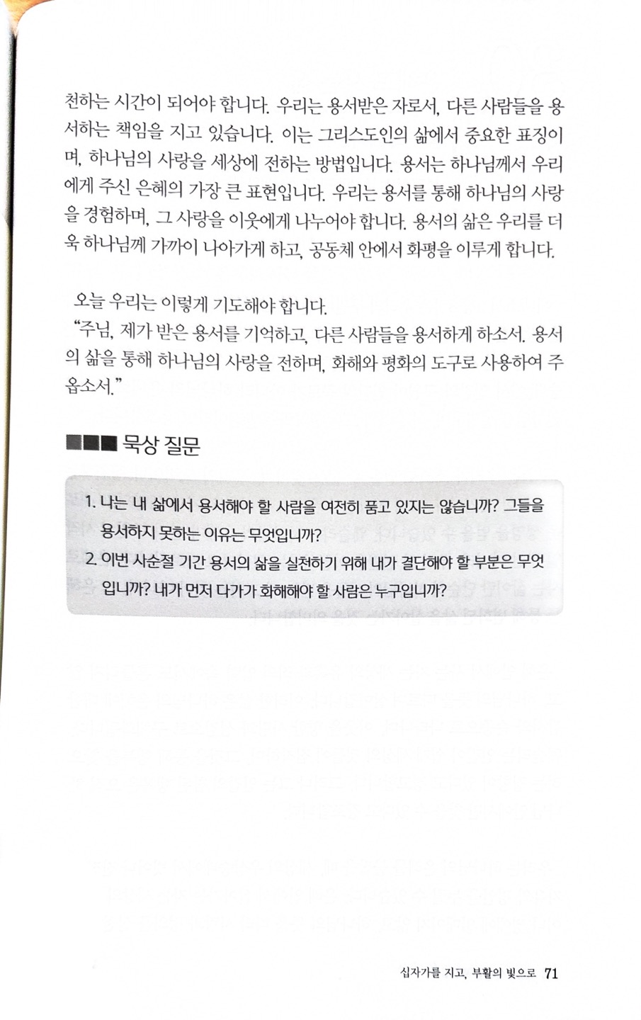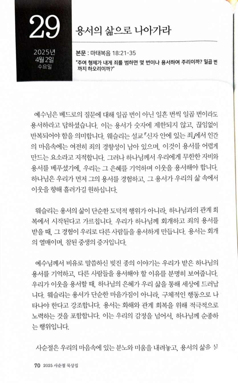 사순절 25일 묵상(용서의 삶으로 나아가라) 진천교회 댓글 0건 조회 1,245회 작성일 2025-04-02 15:11 가 본문내용 확대/축소 본문 사순절 25일 묵상(용서의 삶으로 나아가라)사순절 25일 묵상(용서의 삶으로 나아가라) "주여 형제가 내게 죄를 범하면 몇 번이나 용서하여 주리이까? 일곱 번까지 하오리이까?"마태복음18장21-35절 목록 댓글목록 이전글사순절 26일 묵상(은혜로 사는 삶) 25.04.03 다음글사순절 24일 묵상(공동체 안에서의 중생의 삶)25.04.02
