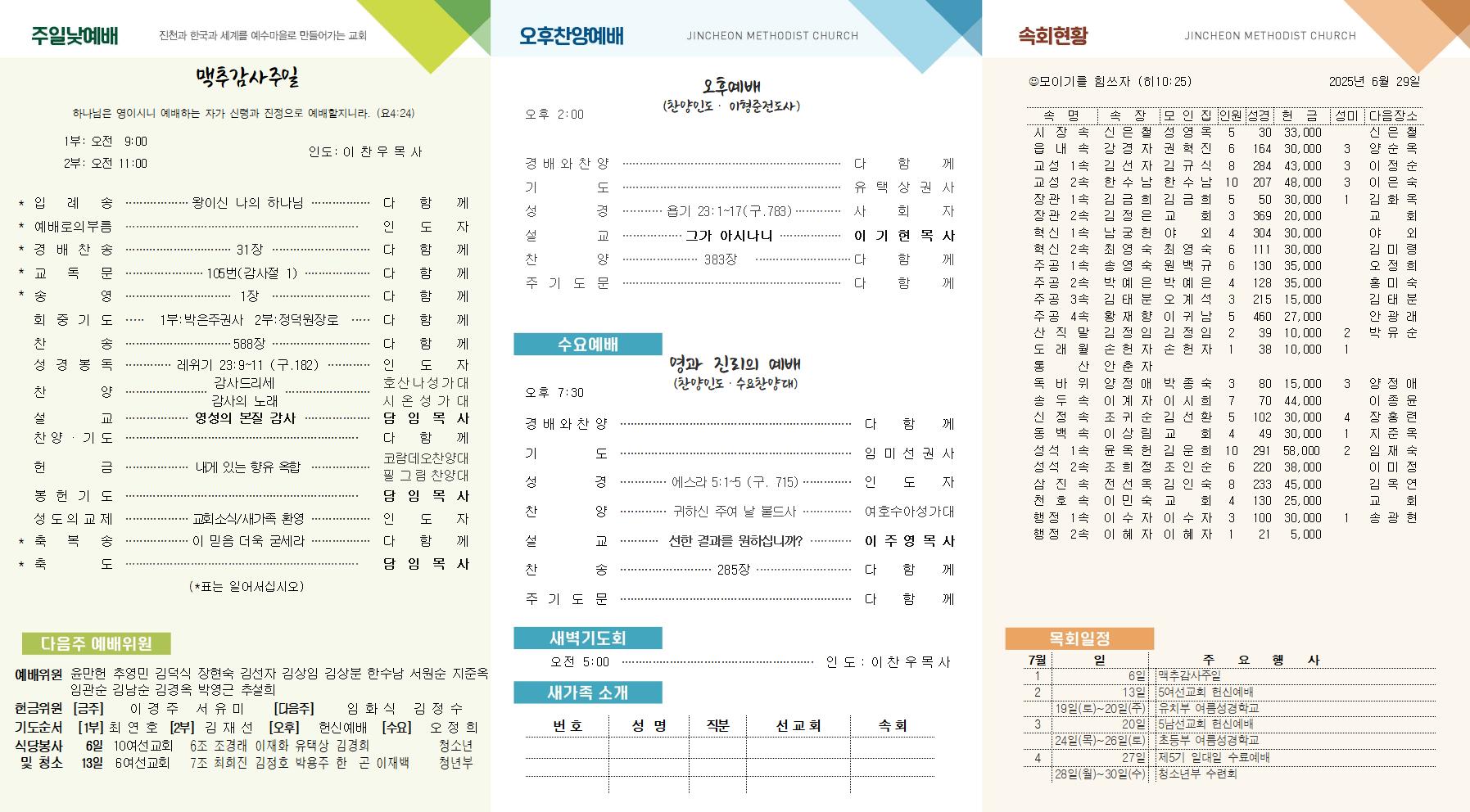7월 6일 주보 진천교회 댓글 0건 조회 1,012회 작성일 2025-07-05 13:12 가 본문내용 확대/축소 본문 7월 6일 주보7월 6일 주보 이스라엘 자손에게 말하여 이르라 너희는 내가 너희에게 주는 땅에 들어가서 너희의 곡물을 거둘 때에 너희의 곡물의 첫 이삭 한 단을 제사장에게로 가져갈 것이요 (레23:10) 아멘 목록 댓글목록 이전글7월 13일 주보 25.07.12 다음글6월 29일 주보25.06.28