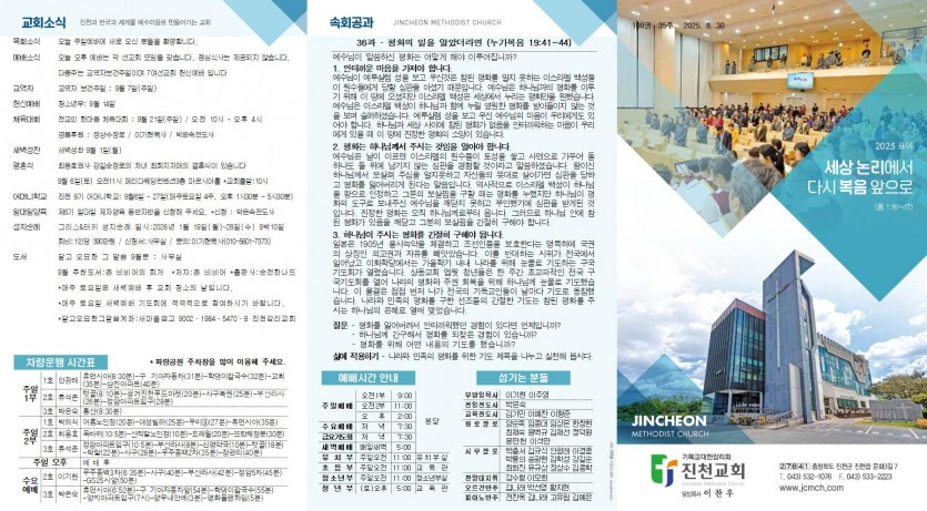 8월 31일 주보 진천교회 댓글 0건 조회 908회 작성일 2025-08-29 18:53 가 본문내용 확대/축소 본문 8월 31일 주보8월 31일 주보 그러므로 우리가 이제부터는 어떤 사람도 육신을 따라 알지 아니하노라 비록 우리가 그리스도도 육신을 따라 알았으나 이제부터는 그같이 알지 아니하노라 (고후 5:16) 아멘 목록 댓글목록 이전글9월 7일 주보 25.09.06 다음글8월 24일 주보25.08.22