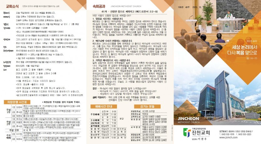 10월 5일 주보 진천교회 댓글 0건 조회 388회 작성일 2025-10-03 18:58 가 본문내용 확대/축소 본문 10월 5일 주보10월 5일 주보 여호와여 나의 원수들로 말미암아 주의 의로 나를 인도하시고 주의 길을 내 목전에 곧게 하소서 (시5:8) 아멘 목록 댓글목록 이전글10월 12일 주보 25.10.11 다음글9월 28일 주보25.09.27