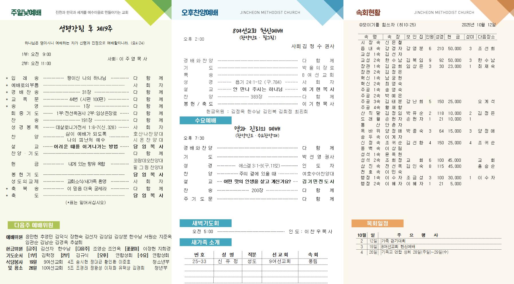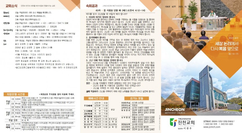 10월 19일 주보 진천교회 댓글 0건 조회 321회 작성일 2025-10-18 09:10 가 본문내용 확대/축소 본문 10월 19일 주보10월 19일 주보 또 너희는 많은 환난 가운데서 성령의 기쁨으로 말씀을 받아 우리와 주를 본받은 자가 되었으니 (살전1:6) 아멘 목록 댓글목록 이전글10월 26일 주보 25.10.25 다음글10월 12일 주보25.10.11