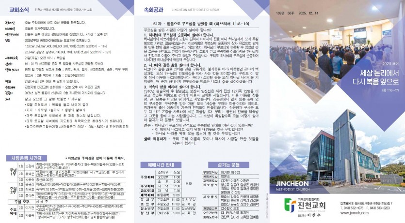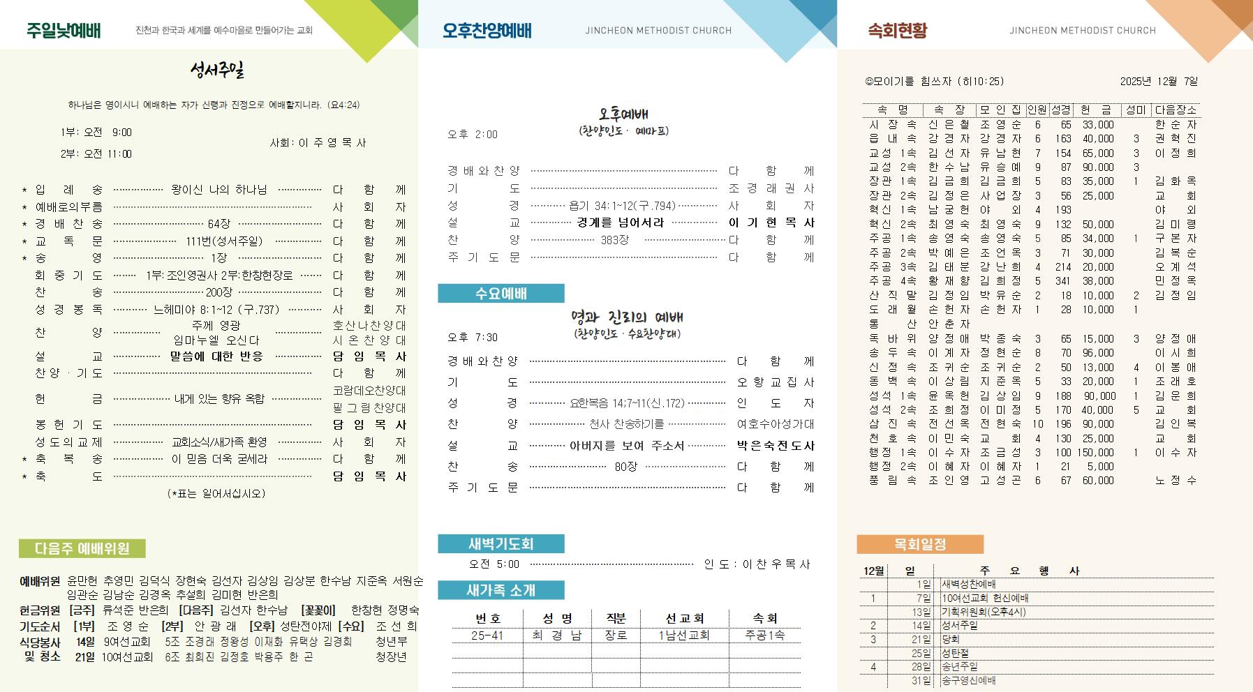 12월 14일 주보 진천교회 댓글 0건 조회 64회 작성일 2025-12-13 09:15 가 본문내용 확대/축소 본문 12월 14일 주보12월 14일 주보 에스라가 위대하신 하나님 여호와를 송축하매 모든 백성이 손을 들고 아멘 아멘 하고 응답하고 몸을 굽혀 얼굴을 땅에 대고 여호와께 경배하니라 (느 8:6) 아멘 목록 댓글목록 다음글12월 7일 주보25.12.06