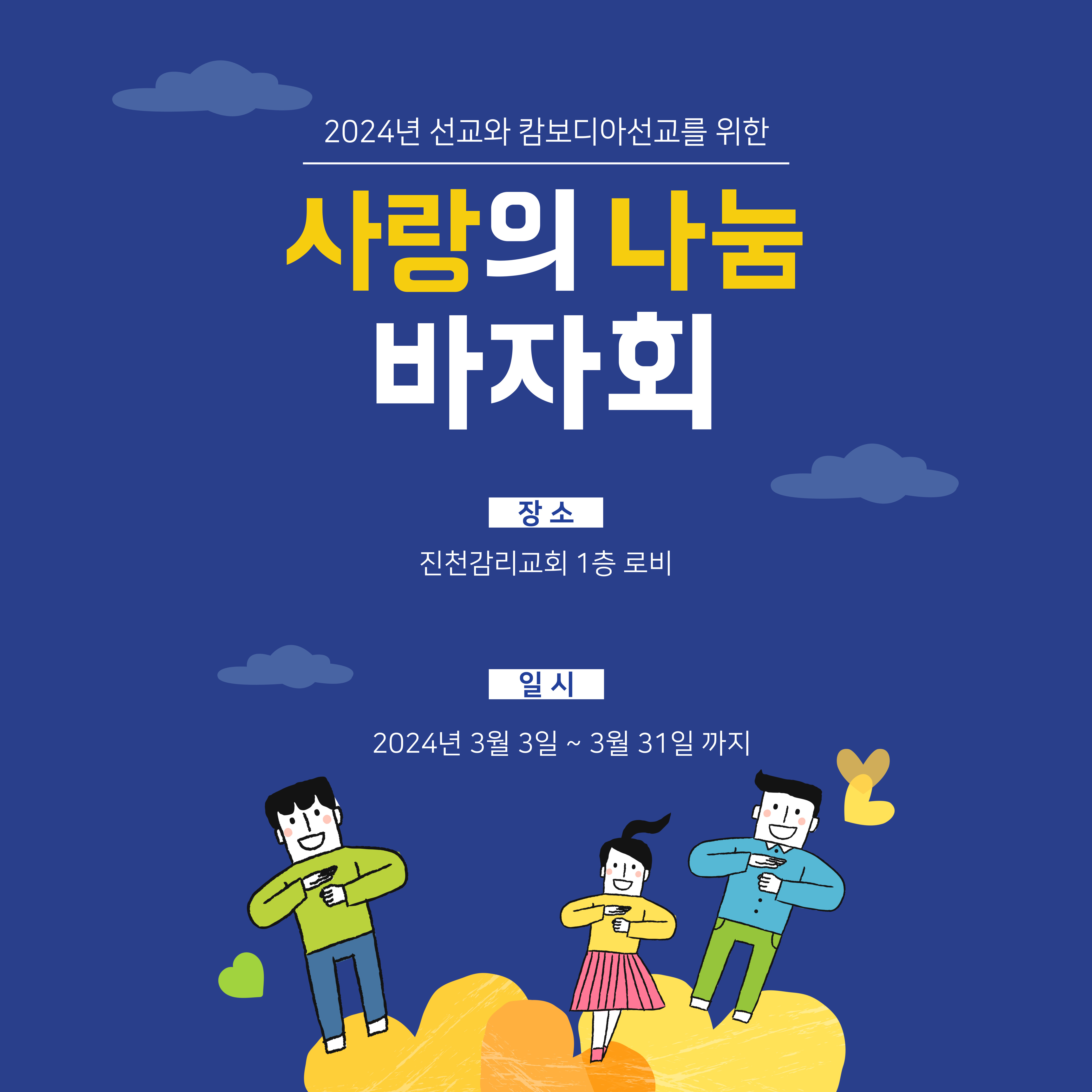 사랑의 나눔 바자회 진천교회 댓글 0건 조회 841회 작성일 2024-02-18 15:00 가 본문내용 확대/축소 본문 사랑의 나눔 바자회 2024년 선교와 캄보디아선교를 위한 사랑의 나눔 바자회물품 후원이 많이 필요합니다.물품후원의 3월 3일까지 사무실로 가져다 주시면 감사하겠습니다. 목록 댓글목록 이전글이단세미나 24.03.05 다음글속장 인도자 세미나24.02.18