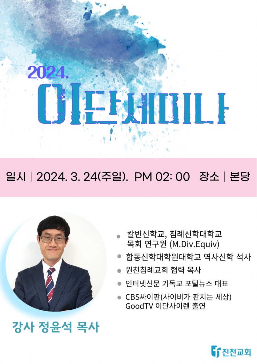 이단세미나 진천교회 댓글 0건 조회 777회 작성일 2024-03-05 15:26 가 본문내용 확대/축소 본문 이단세미나 2024년 3월 24일 오후 2시 본당 목록 댓글목록 이전글교사학부모교육 24.03.26 다음글사랑의 나눔 바자회24.02.18